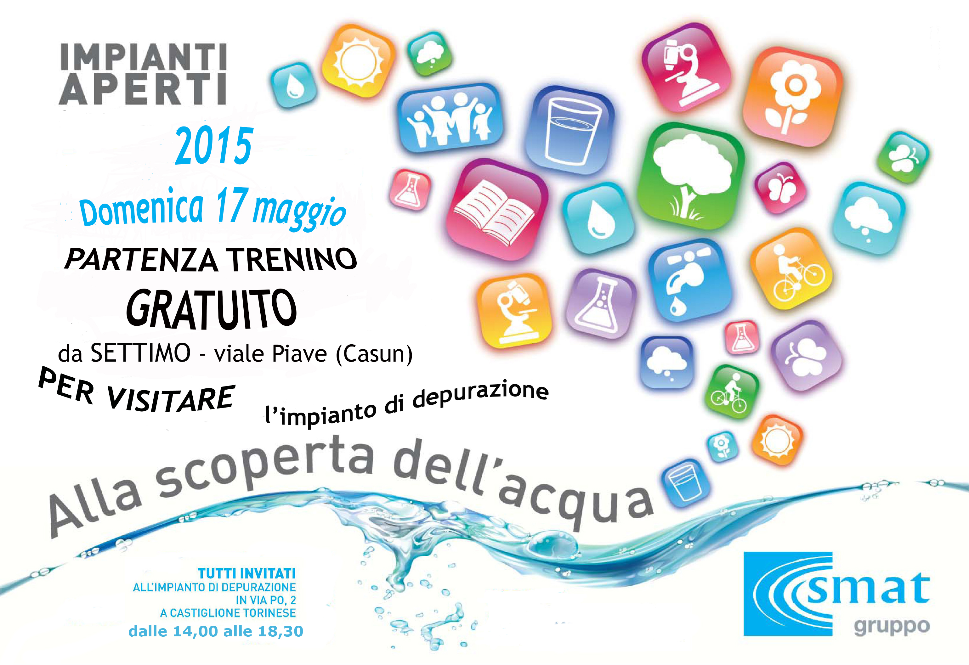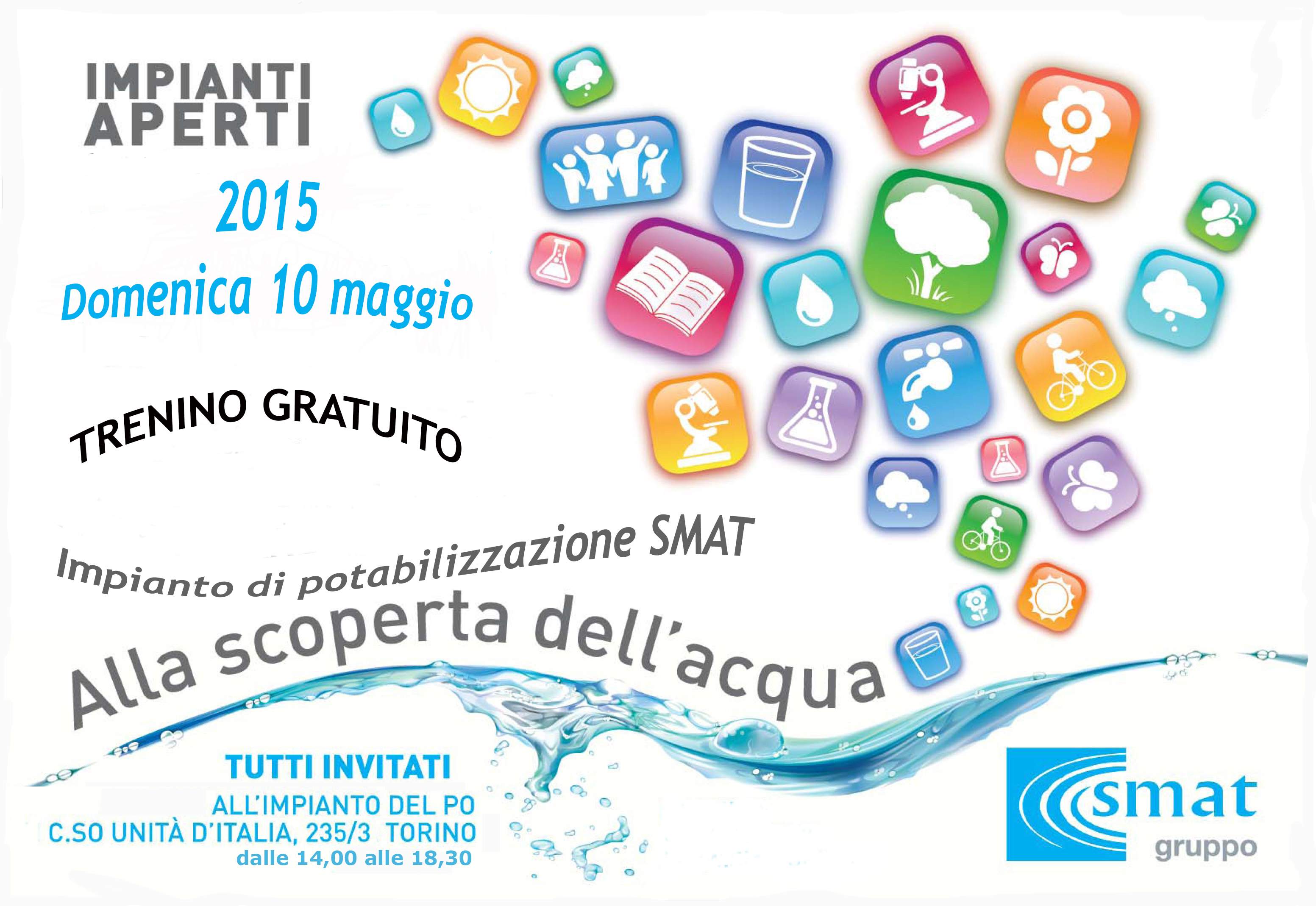 SMAT comunica che in occasione del consueto appuntamento “Impianti Aperti” quest’anno verranno aperti alla cittadinanza l’Impianto di potabilizzazione del fiume Po (Corso Unità d’Italia 235/3 ang. Via Maestri del Lavoro, Torino) domenica 10 maggio e l’Impianto di depurazione per l’area metropolitana torinese (Via Po 2, Castiglione Torinese) domenica 17 maggio, con l'organizzazione di visite guidate condotte dai tecnici dell’Azienda.